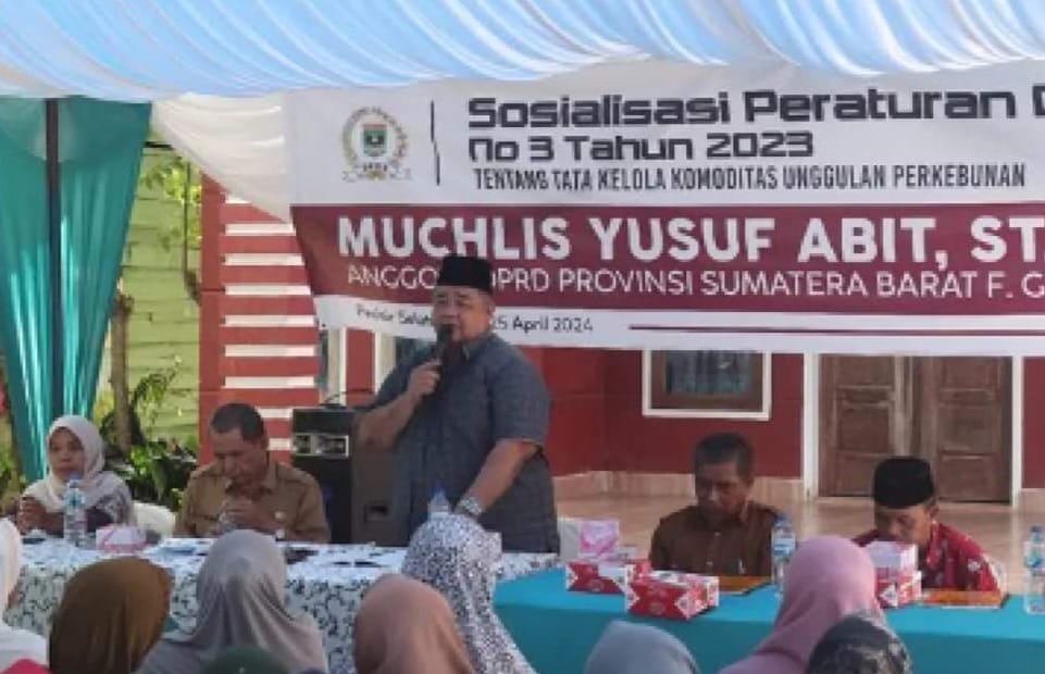 PESSEL (23/4/2024) – Anggota Komisi II DPRD Provinsi Sumbar, Mukhlis Yusuf Abit melaksanakan sosialisasi Peraturan Daerah (Perda) Nomor 3 Tahun 2023 tentang Tata Kelola Komoditas Unggulan Perkebunan, Koto Panai Nagari Air Haji, Kecamatan Linggo Sari Baganti, Kabupaten Pesisir Selatan, Selasa (23/4/2024).