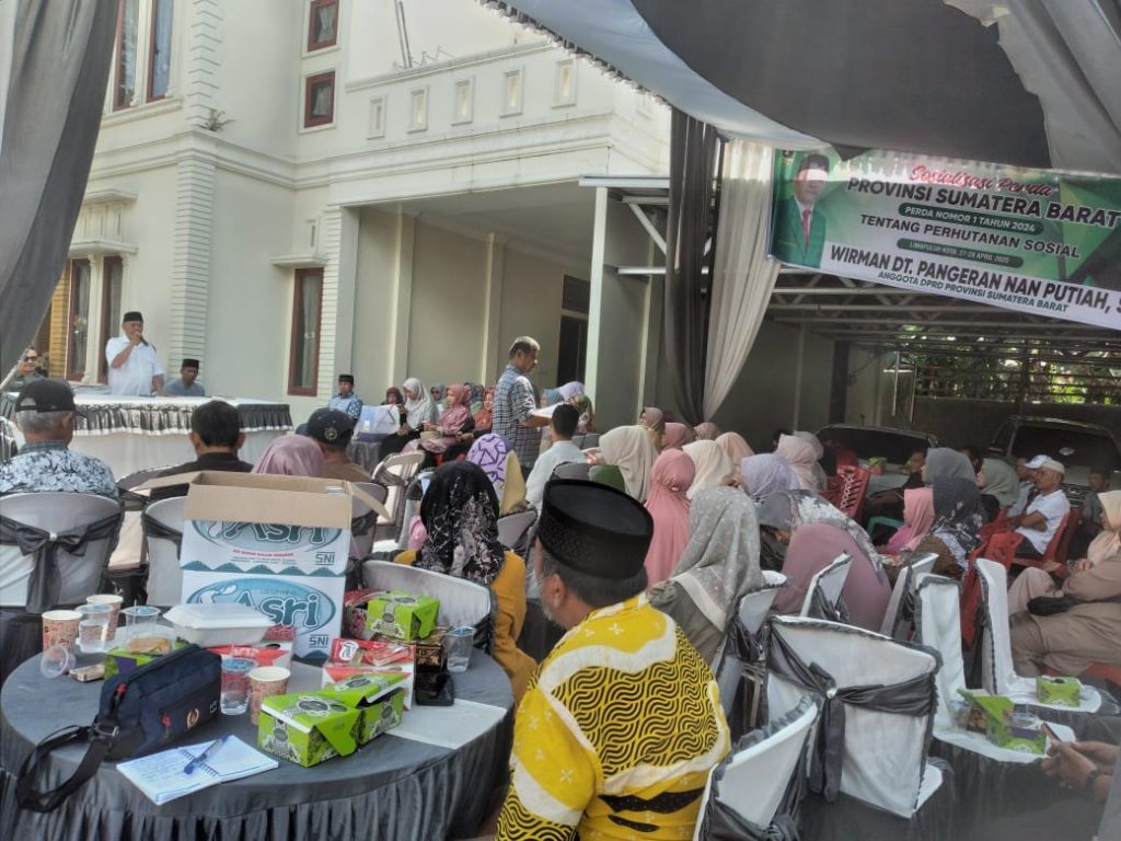 LIMAPULUH KOTA (27/04/2025) — Dinas Kehutanan Provinsi Sumatera Barat selama dua hari, Minggu dan Senin (27-28 April 2025) mengelar Sosialisasi Peraturan Daerah (Perda) Nomor 1 tahun 2024 tentang Kehutanan Sosial di halaman rumah kediaman Wirman Dt. Pangeran Nan Putiah, SH anggota DPRD Sumbar dari Komisi 2, di Jorong Koto Malintang, Nagari Balai Panjang, Kecamatan Lareh Sago Halaban. Giat sosialisasi ini merupakan pokok-pokok pikiran (Pokir) dari Wirman Dt. Pangeran Nan Putiah, SH yang komisinya bermitra dengan Dinas Kehutanan disamping OPD (Organisasai Perangkat Daerah) yang lain.