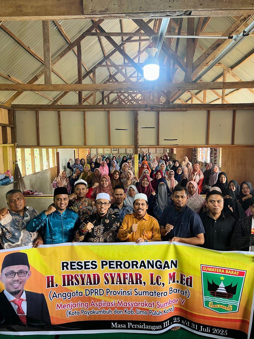 LIMAPULUH KOTA (26/07/2025) –Anggota DPRD Provinsi Sumatera Barat, Irsyad Syafar, menyerap beragam aspirasi masyarakat saat menggelar kegiatan reses perseorangan masa sidang ketiga Tahun 2025-2026, Sabtu (26/7), di SD IT AR Risalah, Nagari Simalanggang, Kabupaten Lima Puluh Kota.