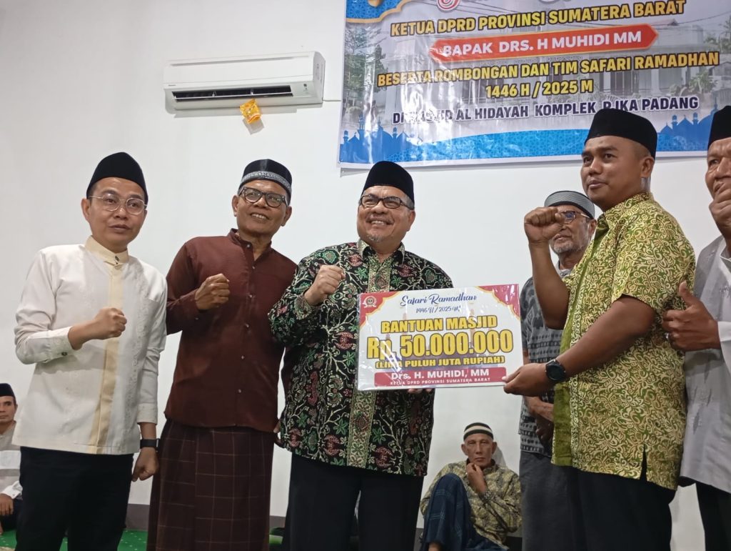 Poin tersebut salah satu ajakan Ketua DPRD Provinsi Sumatera Barat Muhidi saat melaksanakan Safari Ramadhan di Mesjid Al Hidayah, Kompleks PJKA, Kelurahan Sawahan, Kecamatan Padang Timur, Kota Padang Selasa 18 Maret 2025.