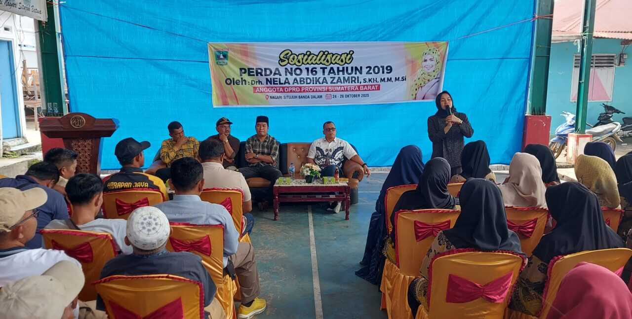 LIMAPULUHKOTA (26/10/2025) — Anggota Dewan Perwakilan Rakyat Daerah (DPRD) Provinsi Sumatera Barat (Sumbar) Komisi III drh. Nela Abdika Zamri, menggelar kegiatan reses sekaligus sosialisasi Peraturan Daerah (Perda) Provinsi Sumatera Barat Nomor 16 Tahun 2019 tentang Pemberdayaan dan Perlindungan Koperasi dan Usaha Kecil. Acara itu berlangsung di Nagari Situjuah Batua, Kecamatan Situjuah Limo Nagari, Kabupaten Limapuluh Kota, Minggu (26/10), dihadiri kurang lebih 200 orang konstituen dari dua nagari, yaitu Situjuah Batua dan Situjuah Banda Dalam.