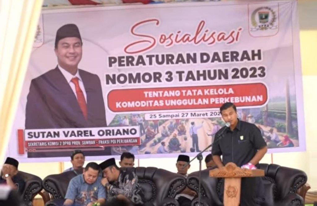 DHARMASRAYA (27/03/20205) – Anggota DPRD Sumatera Barat, Sutan Varel Oriano, menggelar sosialisasi Peraturan Daerah (Perda) No.3 Tahun 2023 tentang Tata Kelola Komoditas Unggulan Perkebunan di Nagari Koto Baru, Kecamatan Koto Baru, Kabupaten Dharmasraya, Kamis (27/03/2025).