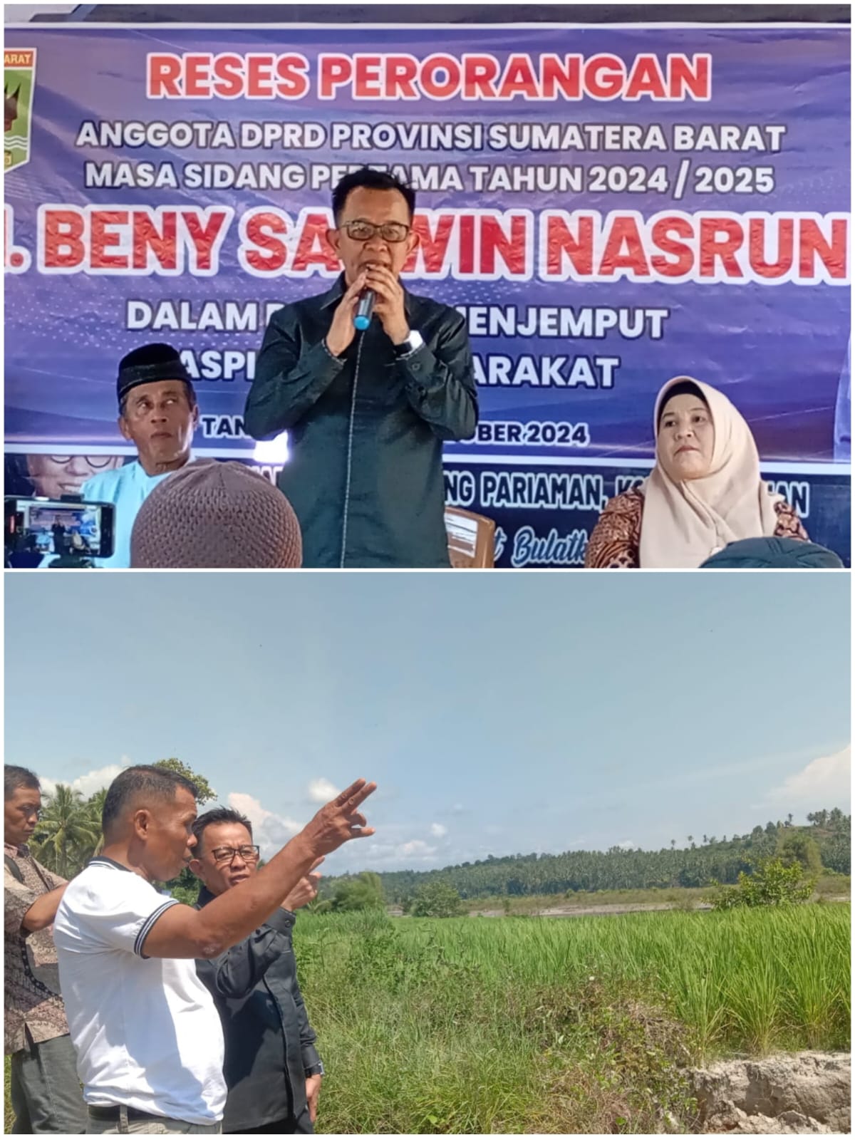 PADANG PARIAMAN (30/10/2024) —  Anggota Komisi III DPRD Provinsi Sumatera Barat, Benny Saswin Nasrun langsung meninjau ke lokasi usai menerima aspirasi masyarakat dari daerah pemilihannya di Kabupaten Padang Pariaman, Rabu 30 Oktober 2024.